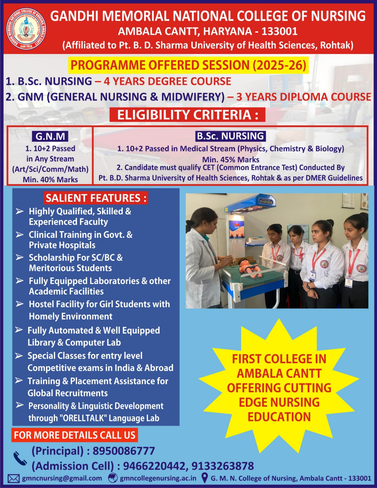 G.M.N. College of Nursing Ambala Cantt Haryana is Established in the year 2024, Run by G.M.N. College Trust & Management Society (Regd.) A premier college of nursing, aims to achieve excellence in nursing education, practice, and research that meets national and international standards. The programs run by college are designed to keep pace with the ever-changing healthcare industry & its environment, where healthcare is envisioned as an integrated three-dimensional model – education, research, and service.